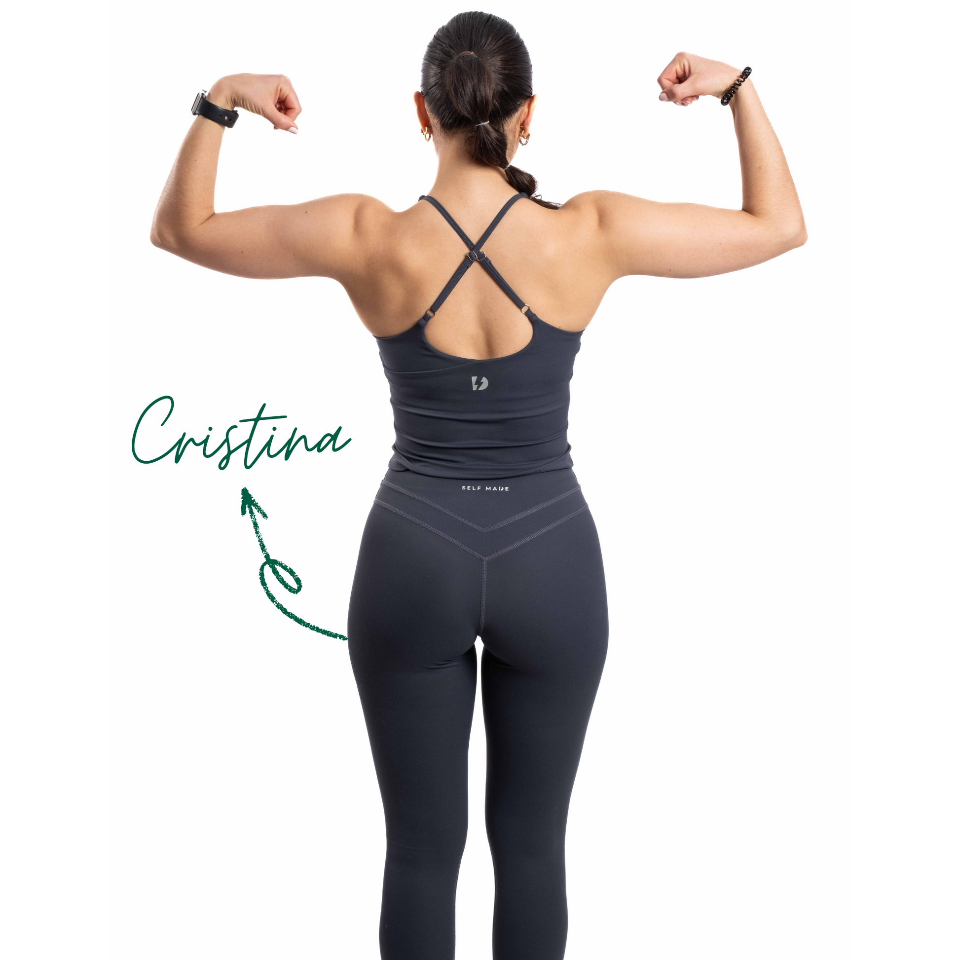Top con espalda al descubierto (escote en V + tiras cruzadas) y legging con costuras en V que realzan tus curvas naturales. Gris marengo para un look único.